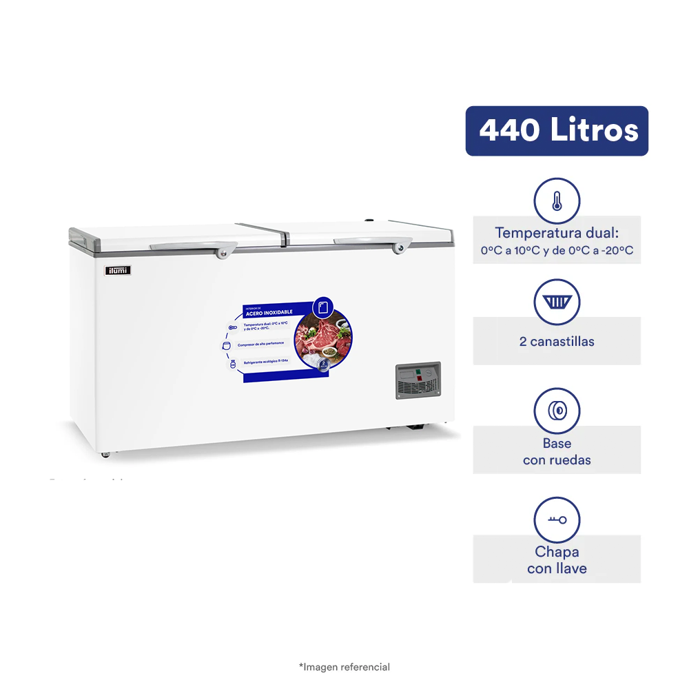 La Ilumi TFI-4402WH es una congeladora horizontal de gran capacidad (440 litros), ideal para hogares y negocios que requieren almacenamiento eficiente de alimentos. Cuenta con temperatura dual que permite usarla como congelador o refrigerador, interior de acero inoxidable para mayor durabilidad y potente compresor que garantiza un enfriamiento uniforme. Su diseño incluye doble tapa, canastillas organizadoras y cerradura de seguridad, brindando practicidad, alto rendimiento y excelente conservación.