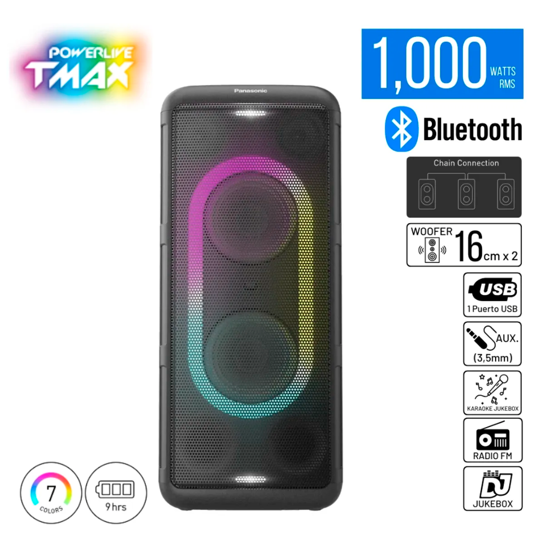 El Panasonic SC-TMAX45 es un potente sistema de sonido tipo One Box con 1000 W RMS, diseñado para ofrecer un audio potente y graves profundos ideales para fiestas y reuniones. Cuenta con conectividad Bluetooth, puerto USB y entradas para micrófono y guitarra, permitiendo reproducir música desde diferentes dispositivos o disfrutar de karaoke. Además, incorpora doble woofer, tweeters y luces LED multicolor, creando una experiencia de sonido envolvente y un ambiente de fiesta dinámico.