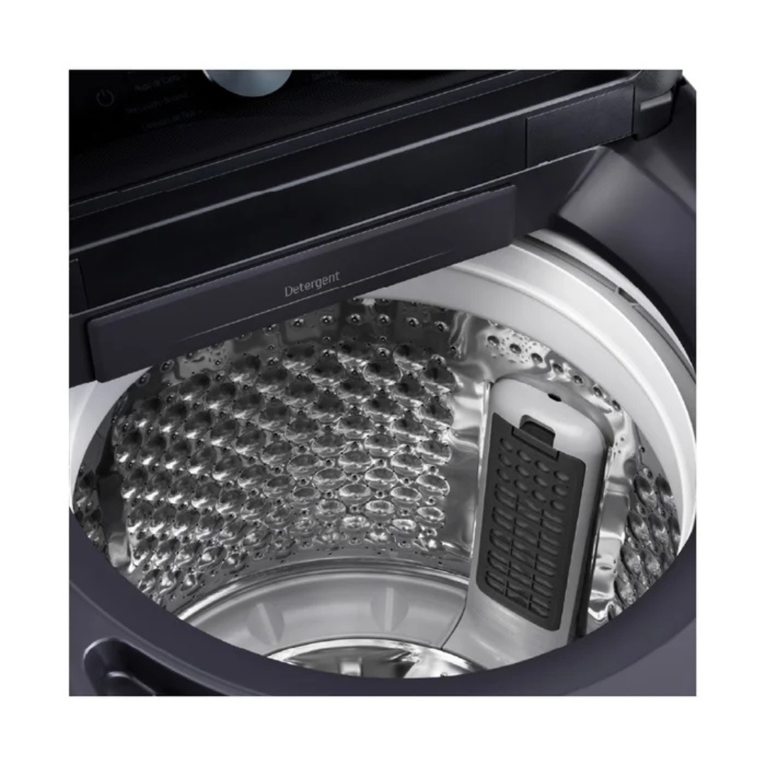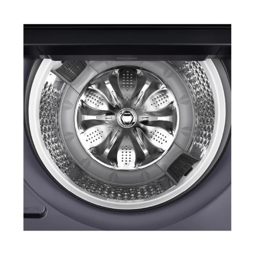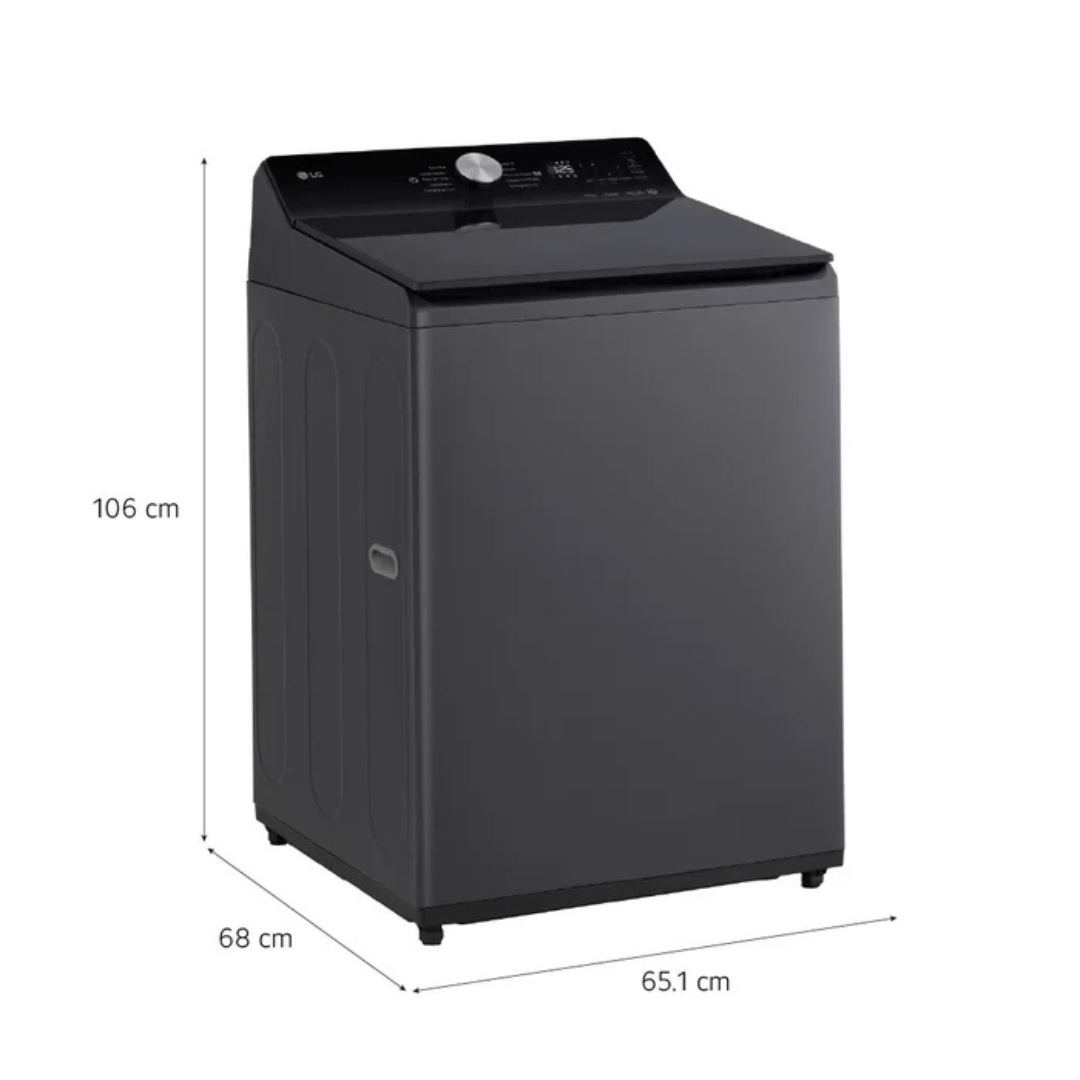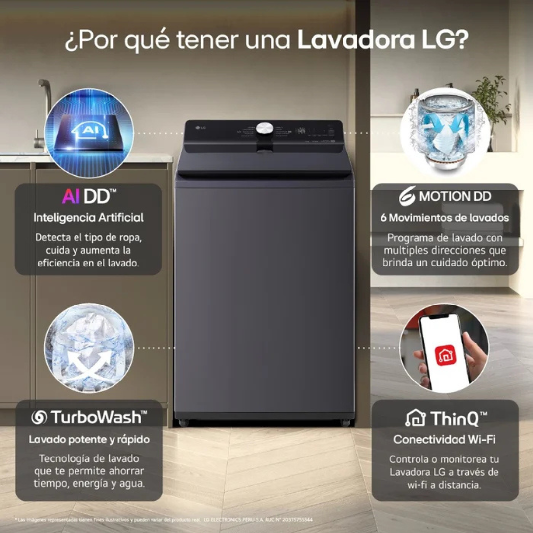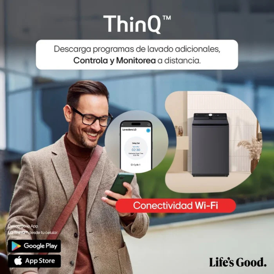 La LG WT22EGTX es una lavadora automática de carga superior con capacidad de 22 kg, ideal para familias grandes y cargas voluminosas de ropa. Incorpora tecnología AI DD™ con inteligencia artificial, que detecta el peso y tipo de tejido para ajustar automáticamente el movimiento de lavado y cuidar mejor las prendas. Además, cuenta con TurboWash™ para una limpieza rápida y eficiente, motor Smart Inverter y panel digital, ofreciendo un lavado potente, inteligente y de bajo consumo energético.