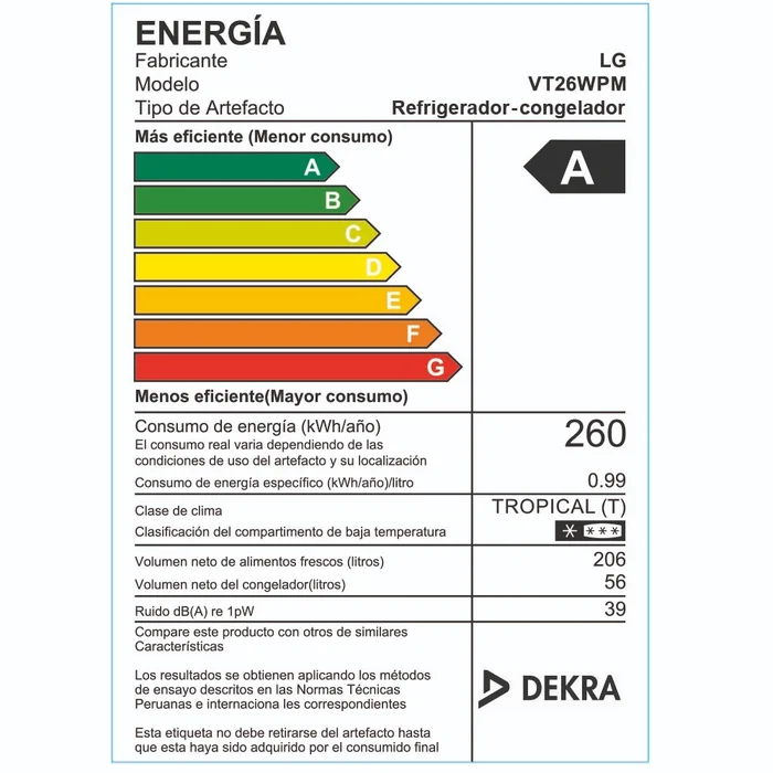 La LG VT26WPM es una refrigeradora Top Freezer de 262 L de capacidad, diseñada para mantener los alimentos frescos por más tiempo gracias a su tecnología Linear Cooling™, que reduce las variaciones de temperatura dentro del refrigerador. Además, cuenta con sistema Multi Air Flow que distribuye el aire frío de forma uniforme, compresor Smart Inverter para mayor eficiencia energética y menor ruido, y sistema No Frost, que evita la formación de escarcha y facilita el mantenimiento.