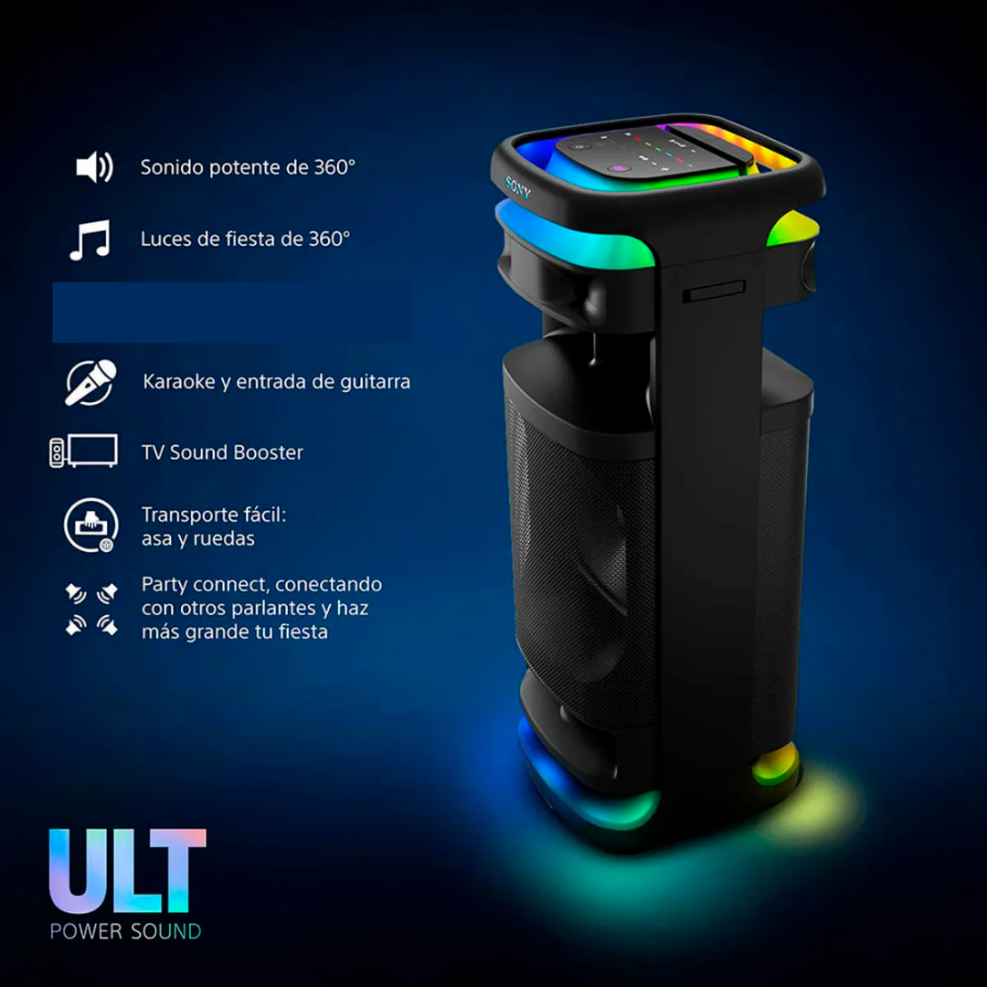 El Sony SRS-ULT1000 (ULT Tower 10) es un potente parlante para fiestas diseñado para ofrecer graves intensos y sonido envolvente de 360° gracias a la tecnología ULT Power Sound. Incorpora luces LED 360° sincronizadas con la música, conectividad Bluetooth, y función karaoke con micrófono inalámbrico incluido, permitiendo animar cualquier reunión o evento. Además, cuenta con entradas para micrófono y guitarra y función TV Sound Booster, que mejora el audio al conectarlo al televisor para una experiencia más inmersiva.