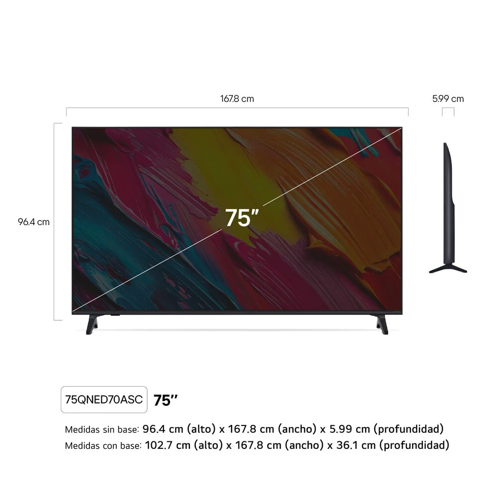 El Televisor LG 75″ QNED 4K UHD Smart TV 75QNED70ASC (Modelo 2025) es un televisor de gran formato renovado para ofrecer una experiencia visual superior y potente, fusionando las tecnologías Quantum Dot y NanoCell para lograr colores más ricos y precisos. Su inmensa pantalla de 75 pulgadas 4K UHD con tecnología QNED ofrece un brillo destacado y gran detalle, ideal para transformar cualquier sala en un cine personal. Integra el nuevo y potente procesador α7 AI 4K Gen8, que utiliza inteligencia artificial avanzada para escalar contenido de menor resolución a 4K con mayor nitidez, profundidad y realismo que las generaciones anteriores.