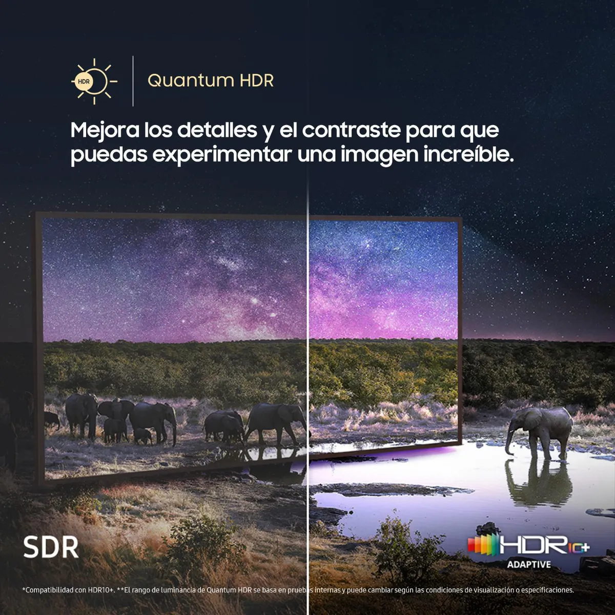 El Samsung QN65Q7FAA es un televisor de 65 pulgadas con tecnología QLED y resolución 4K Ultra HD que ofrece colores más intensos, alto nivel de brillo y excelente contraste. Incorpora procesador de imagen avanzado que optimiza cada escena, además de compatibilidad con HDR10+ para una mejor calidad visual. Su sistema operativo Tizen permite acceder a múltiples aplicaciones de streaming, mientras que su función Gaming Hub brinda una experiencia fluida en videojuegos, ideal para entretenimiento completo en el hogar.